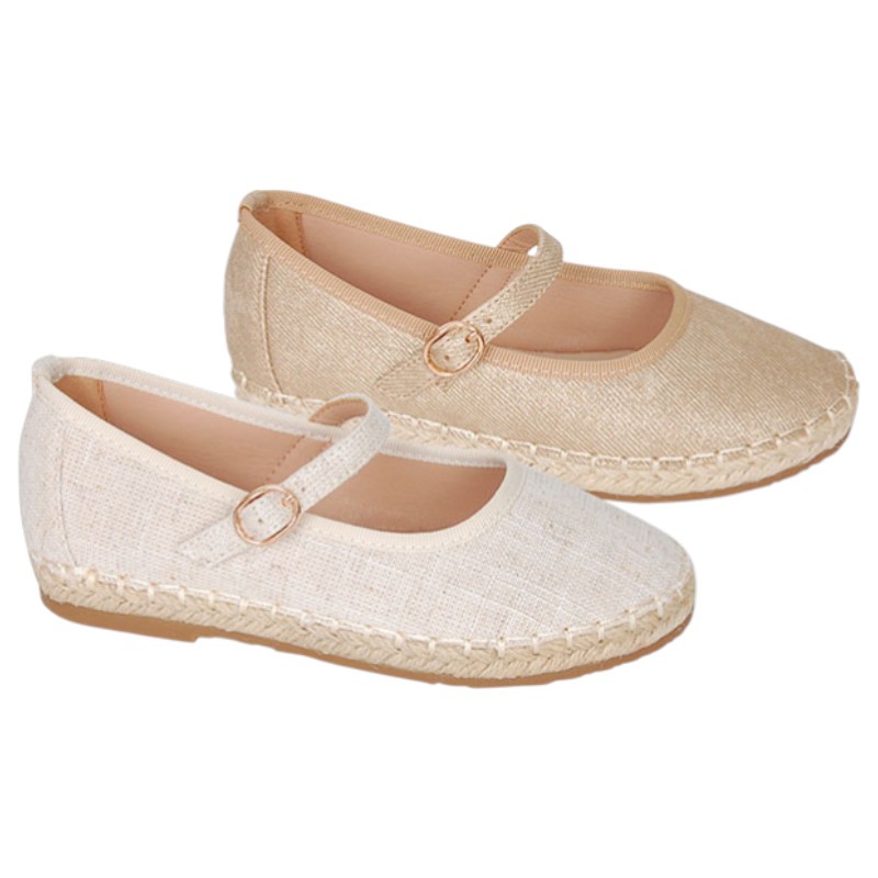 Estas bailarinas niña están fabricadas con tejido lino que tan de moda está para la temporada primavera - verano y para las ocasiones más especiales como para su primera comunión, con el borde de la suela en esparto que le da un toque actual.