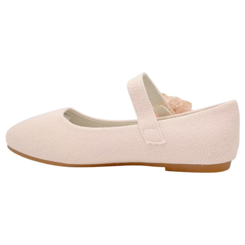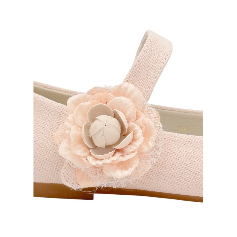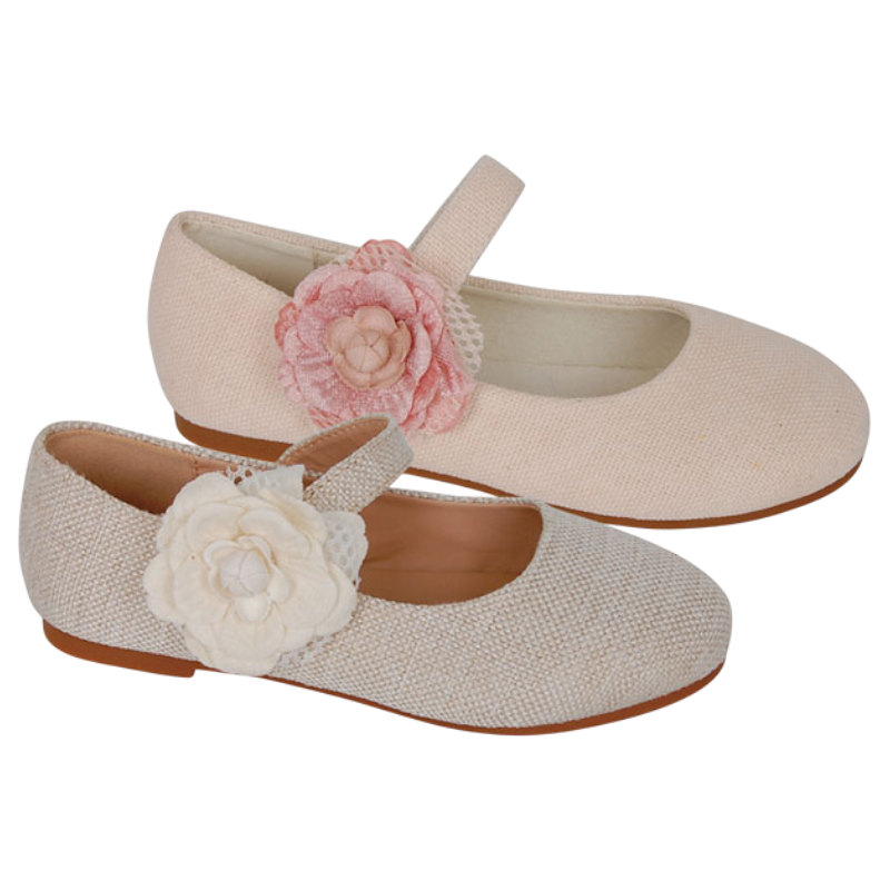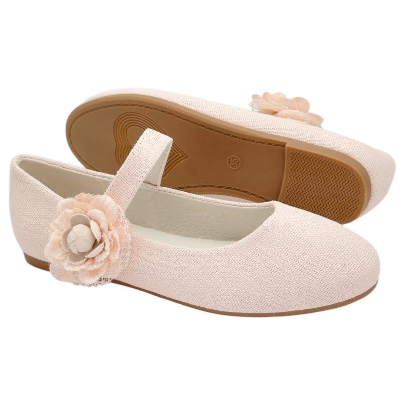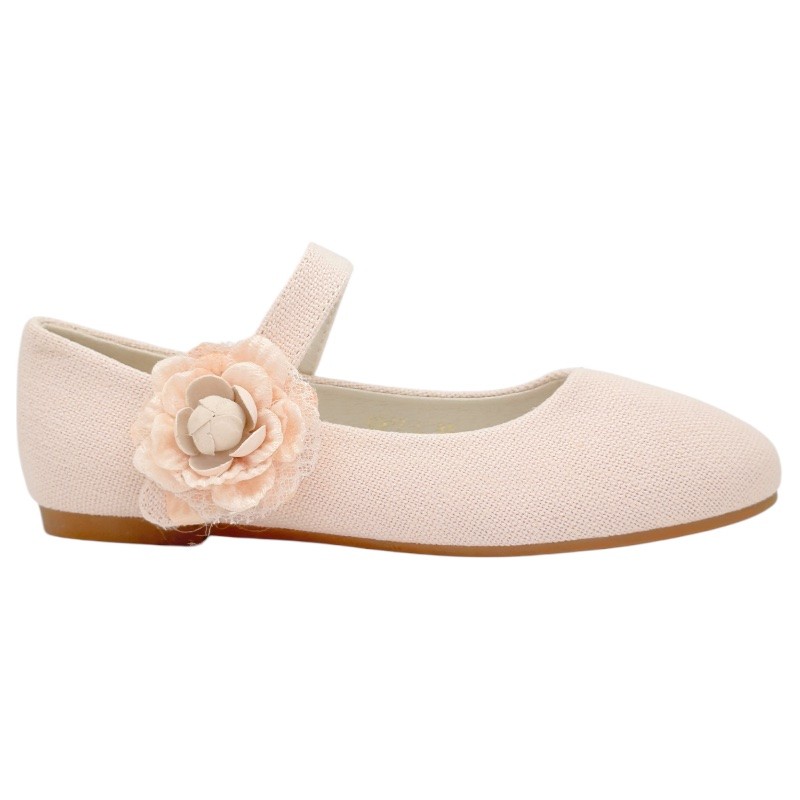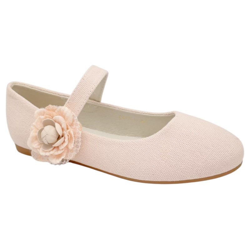 Preciosas bailarinas niña ideales para ocasiones especiales, que puedes encontrar en color nude o lino, con un diseño cuidado y elegante, adornadas con una bonita flor que les da un toque espectacular.