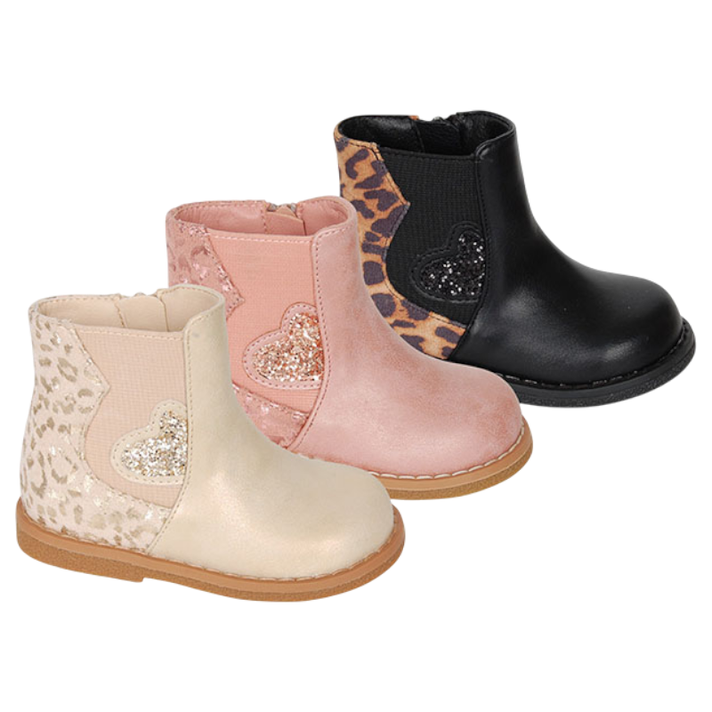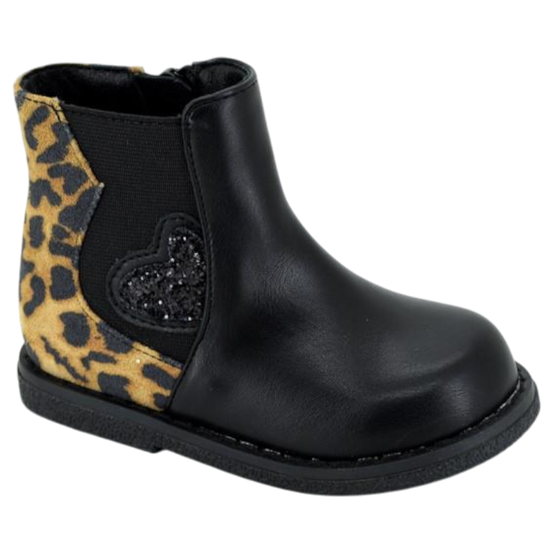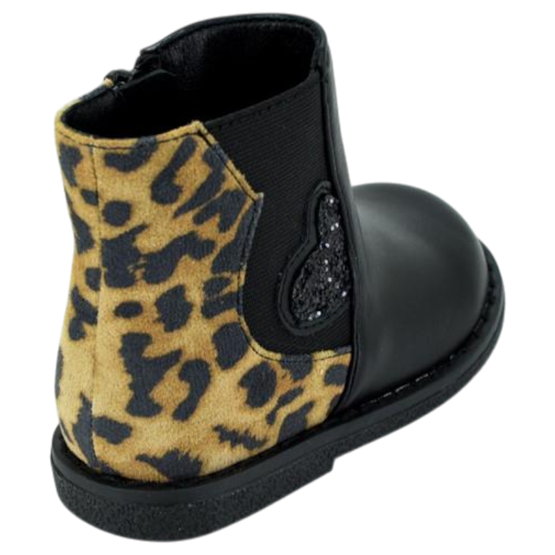 Botines niña con un diseño original en color beige, rosa y negro, con el detalle de un corazón con glitter en el lateral que le da un toque muy dulce y la parte del talón con estampado de leopardo que a la vez le da un toque atrevido y moderno, ya que está totalmente en tendencia.