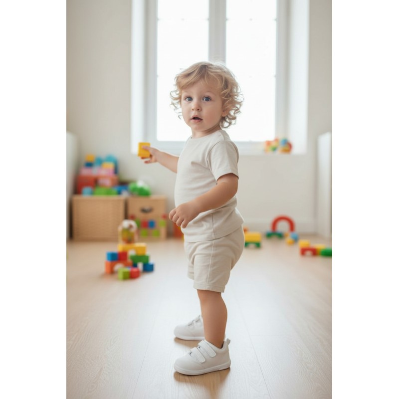 Zapatillas deportivas de la marca Titanitos fabricadas en piel natural lavable, blanditas, flexibles y respetuosas con la forma natural del pie ayudando a su desarrollo desde los primeros pasos