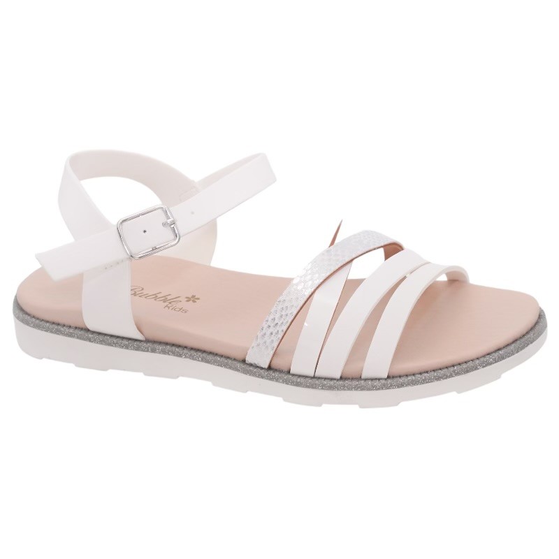 Preciosas sandalias para niña en color blanco combinado con plata o color oro, con un diseño muy original con el detalle en el empeine de unas cintas que le dan ese toque alegre además de sujeción en el pie.