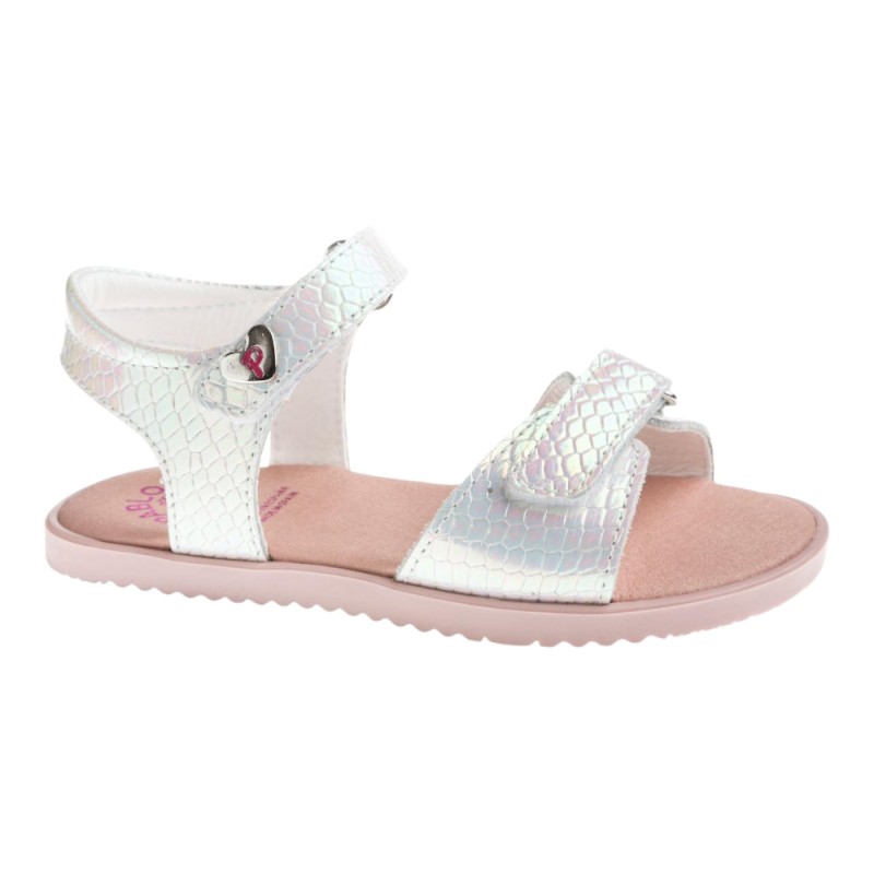 Sandalias barefoot niña de la marca Pablosky en color blanco iridiscente con un diseño casual y moderno, con el detalle de relieve de efecto serpiente, que le dan un toque muy bonito elegante, ideales para combinar con cualquier look esta temporada y brillar con estilo y respetando la pisada.