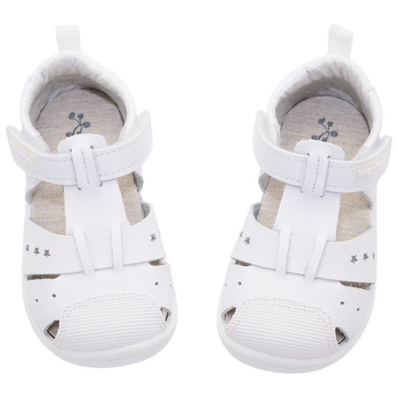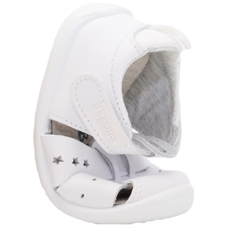 Preciosas sandalias respetuosas de la marca Titanitos, en color blanco, panama y celeste con un diseño cuidado de calado de estrellas en la tira delantera que le dan un toque muy especial, perfectas para combinar con cualquier look de los peques e ir fresquitos.