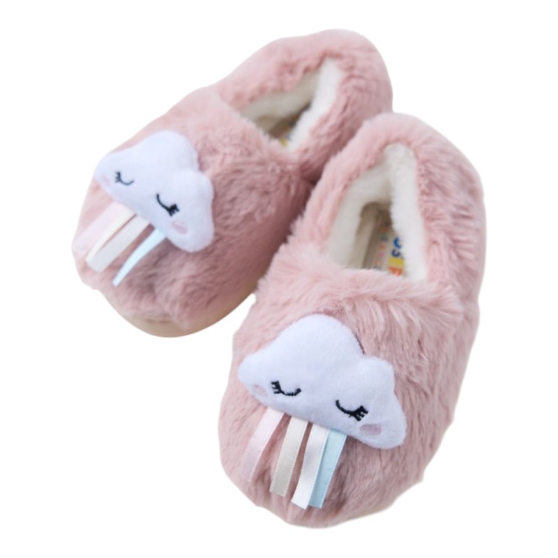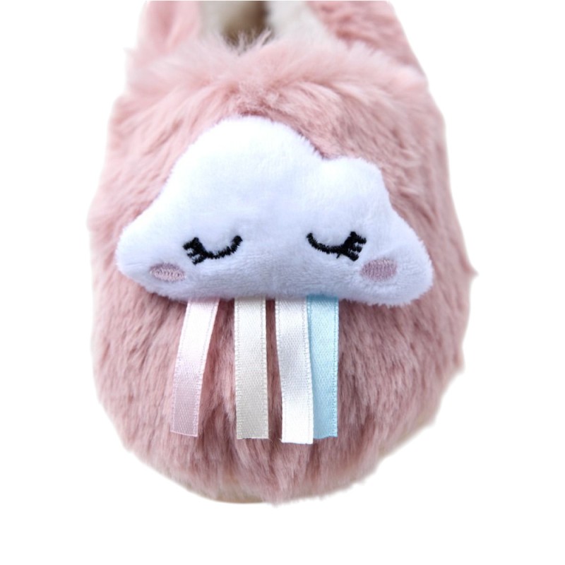 Zapatillas de casa de la marca Gioseppo en color rosa de pelo con un diseño muy gracioso y bonito con el detalle del dibujo de una nube y arcoíris, que las hacen muy cuquis y perfectas para este invierno.