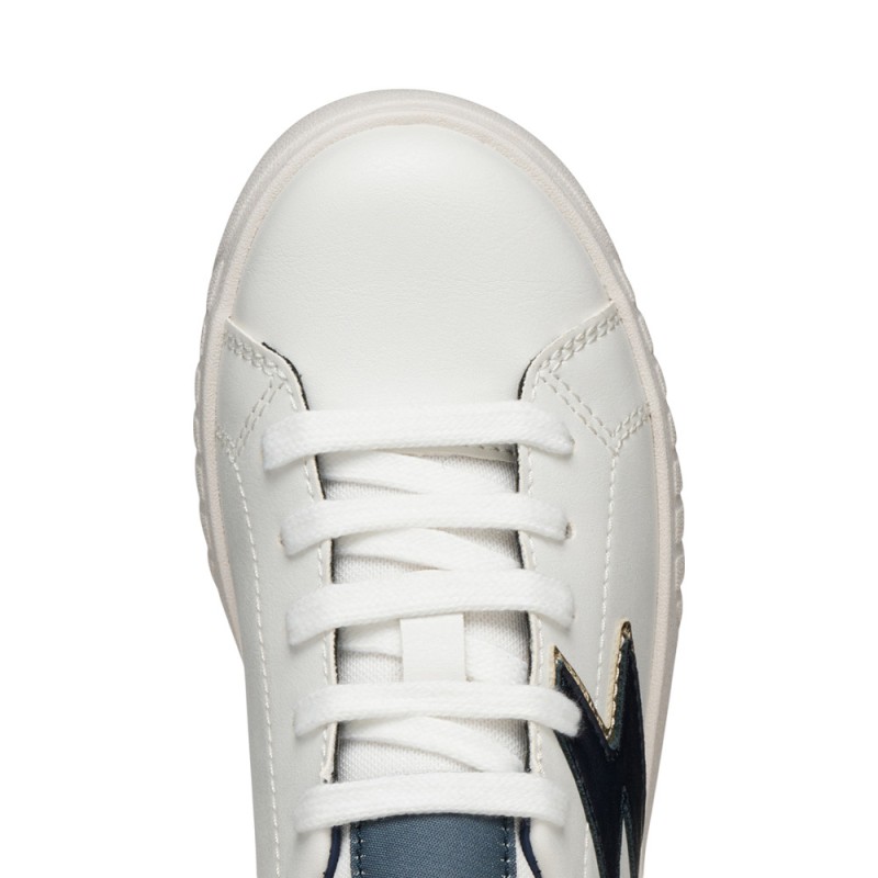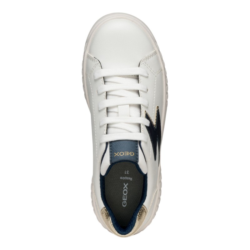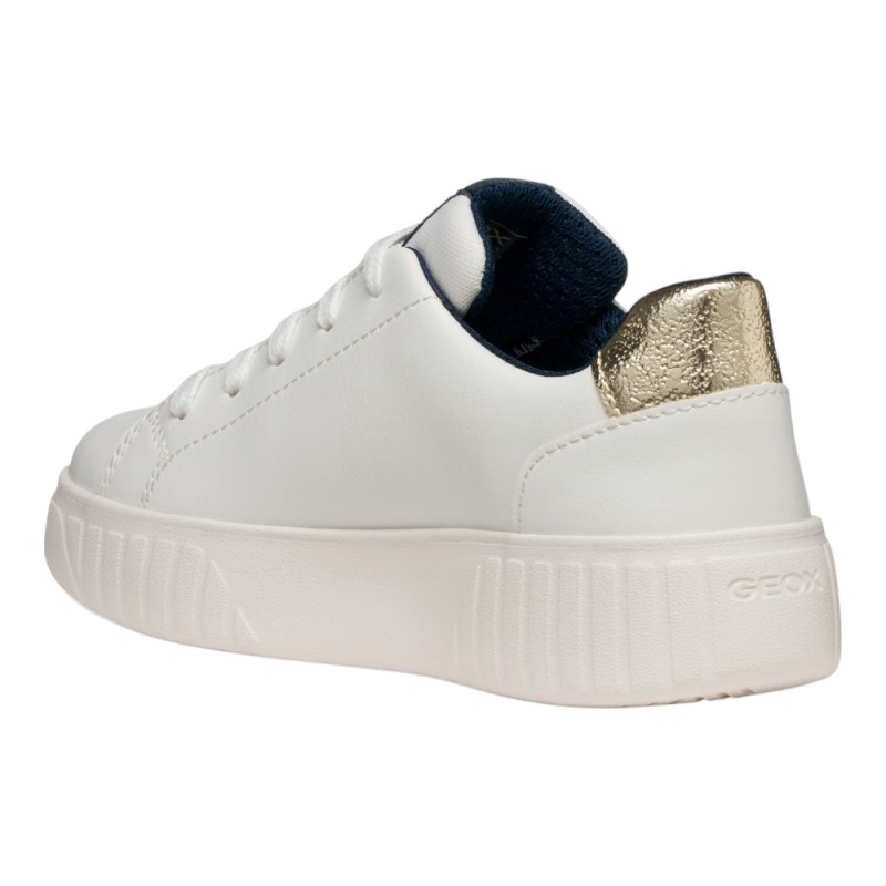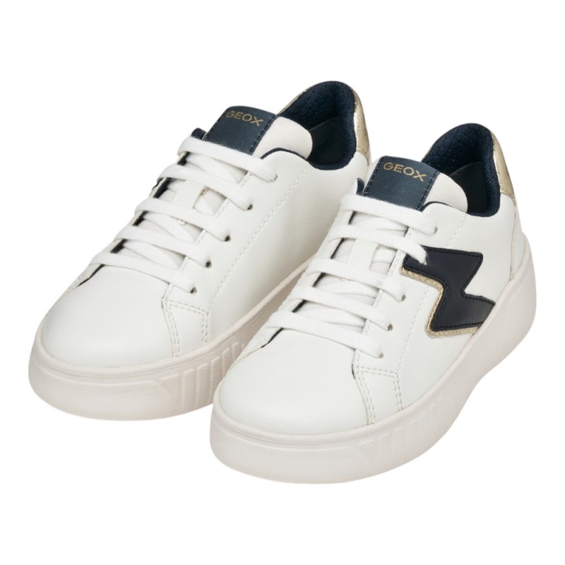 Preciosas zapatillas niña de la marca Geox, con un diseño deportivo a la vez de casual en color blanco con detalles en azul marino y en dorado, ideales para llevar en el día a día de las más mayores para que puedan jugar y disfrutar con un calzado cómodo y de calidad.