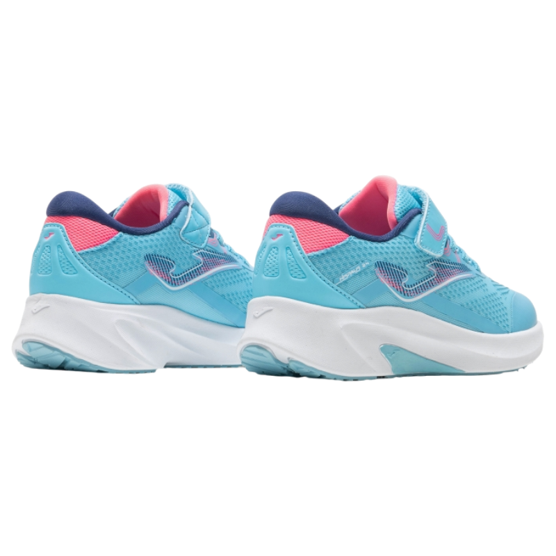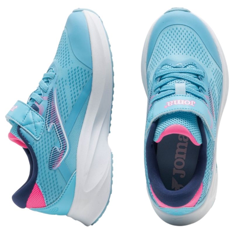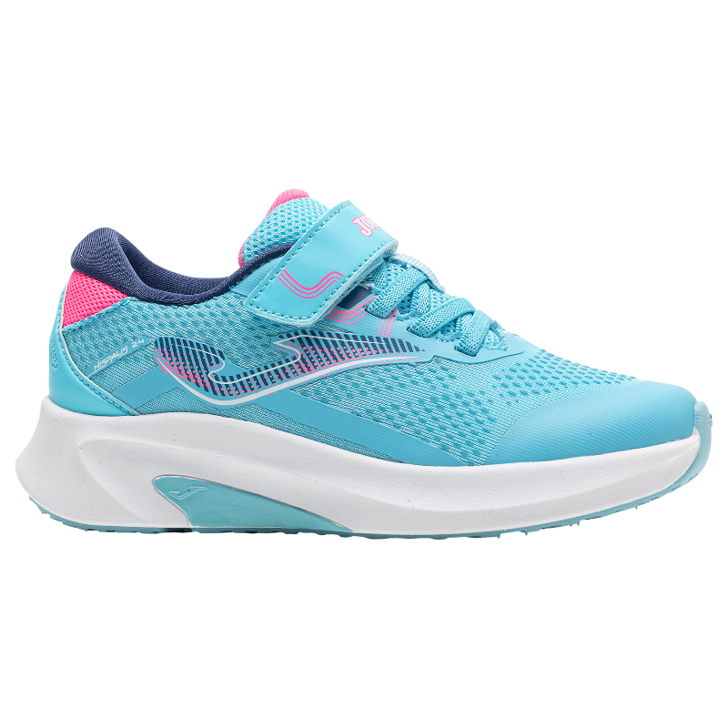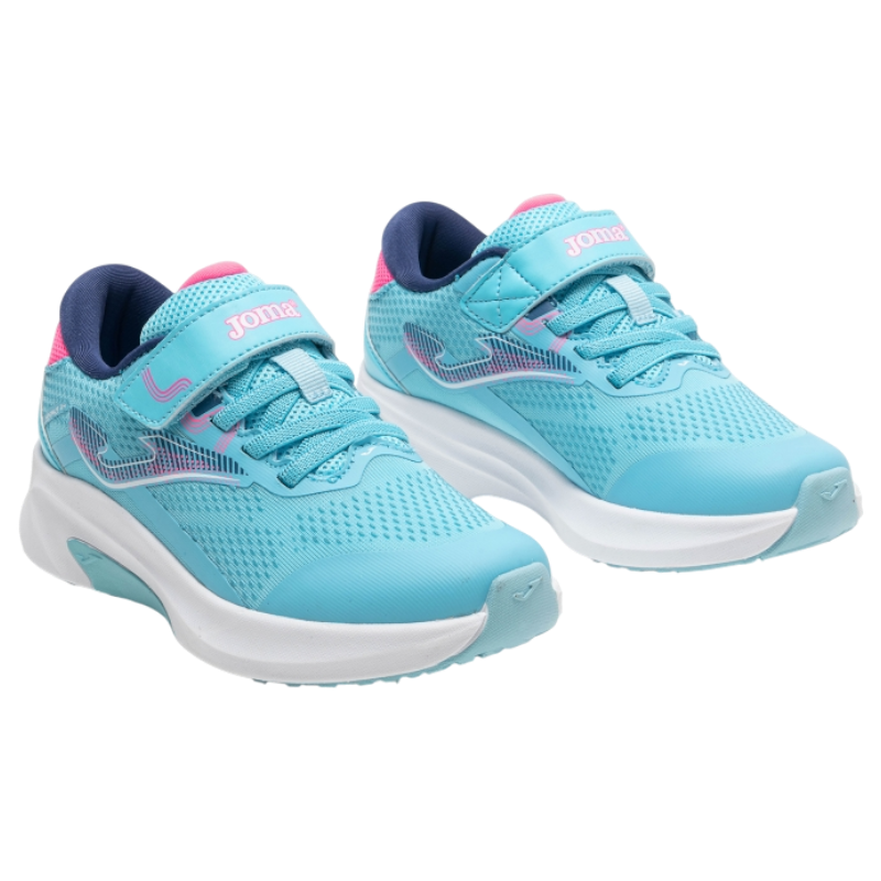 Preciosas zapatillas niña de la marca Joma en color azul celeste con detalles en fucsia, con un diseño muy moderno, actual y deportivo.