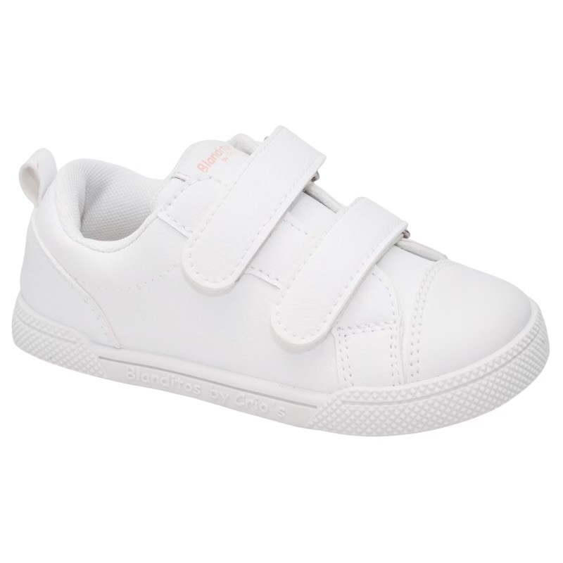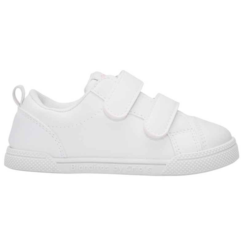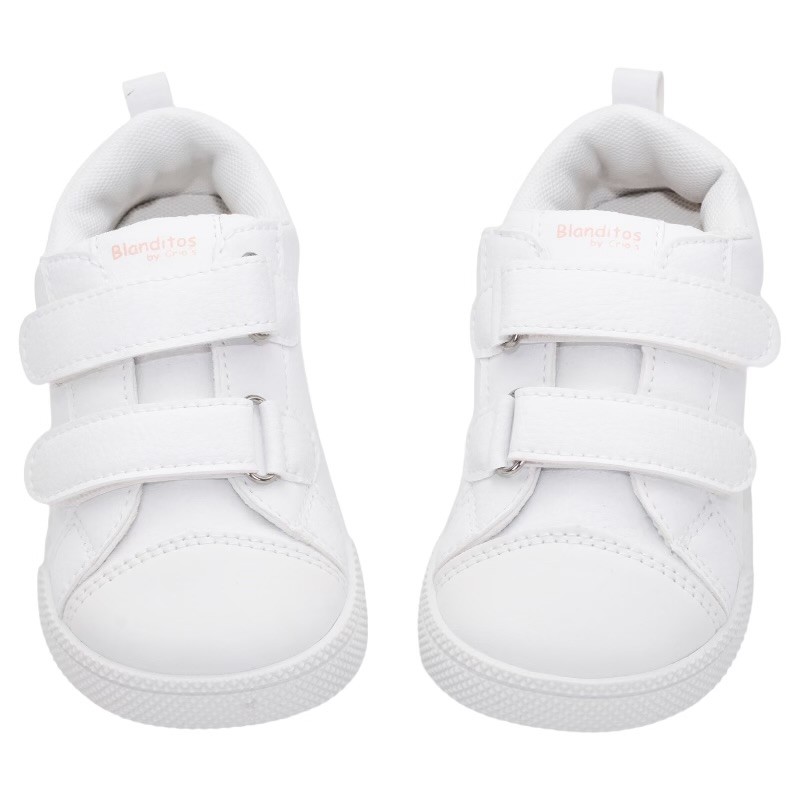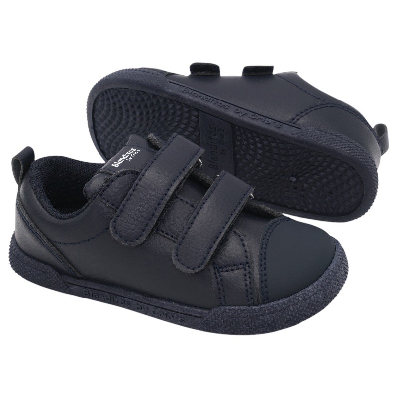 Zapatillas colegiales respetuosas de la marca Blanditos by Crios con un diseño clásico en color blanco y en azul marino, perfectas y muy cómodas para su día a día de la guardería o el colegio, ya que combinan perfectamente con cualquier look y con uniformes.