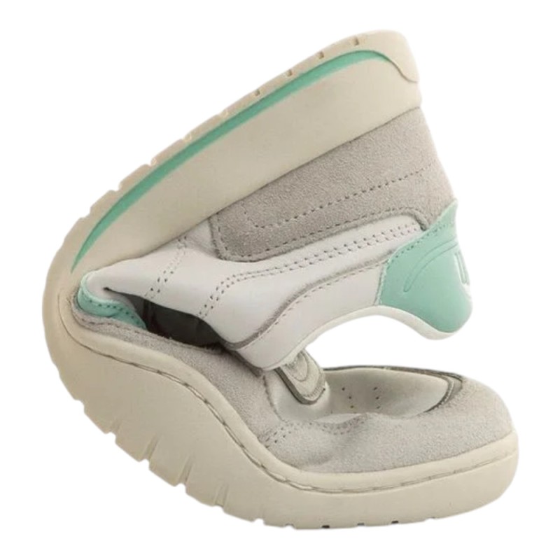 Estas deportivas respetuosas están diseñadas en color blanco, con gris y agua marina, geniales para combinar con cualquier look en el día a día dándole un toque sport a los looks. Estas zapatillas respetuosas están creadas especialmente para esos pies de nuestras peques más mayores que están en constante desarrollo, y para las mamis que quieran una transición a un calzado más minimalista, ya que llegan hasta la talla 41.