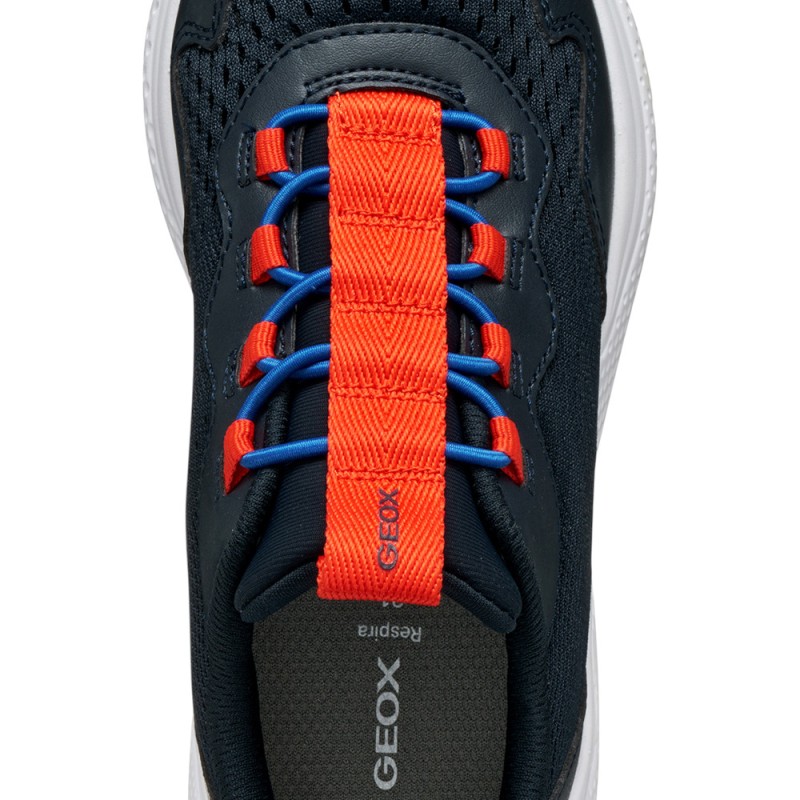 Zapatillas tipo sneakers para niño de la marca Geox con un diseño sport y casual, en color azul marino con detalles en rojo, ideales para tanto hacer deporte e ir al coles como para poder combinar con cualquier tipo de look más informal y sport.