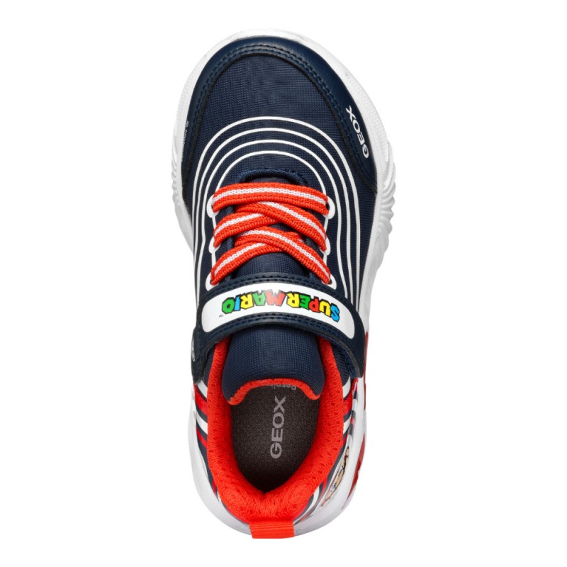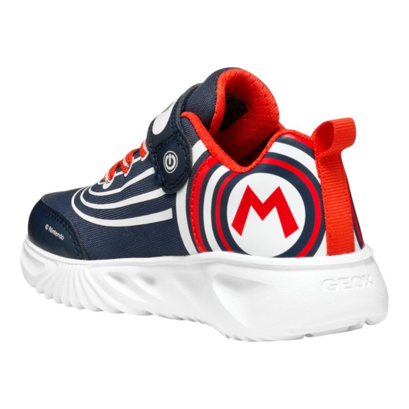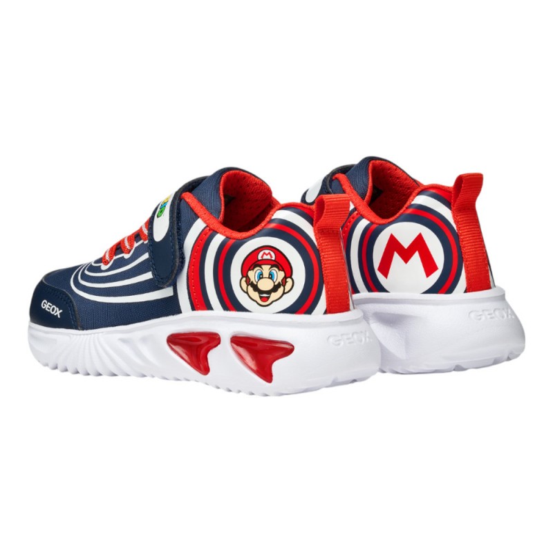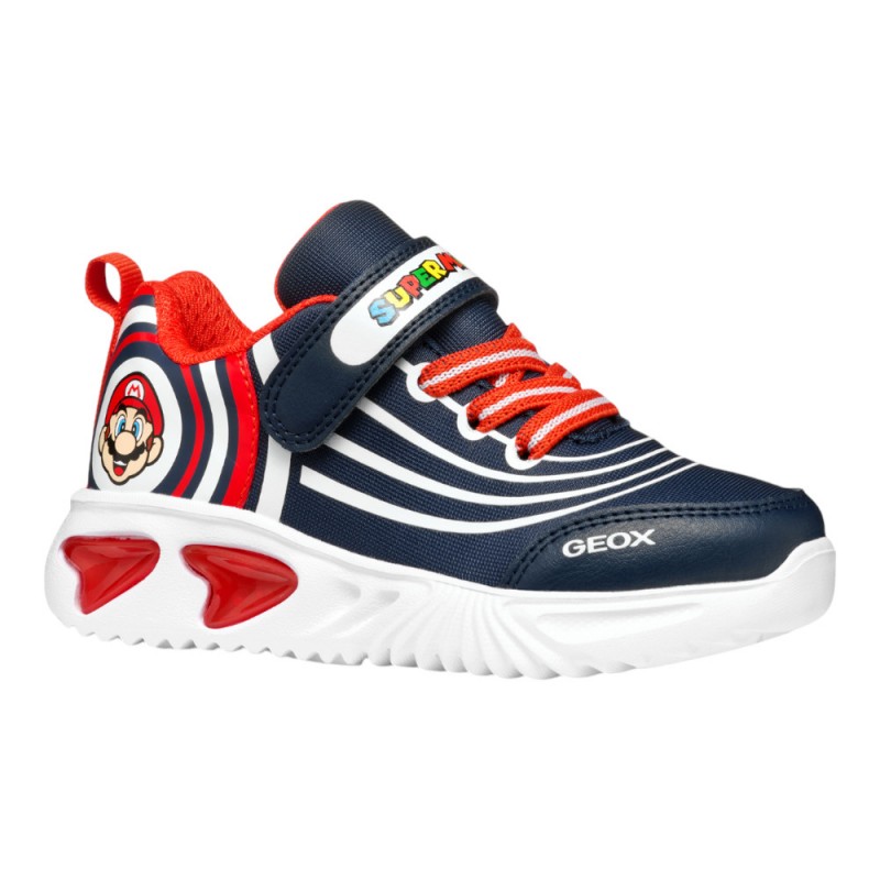 Fantásticas zapatillas niño con luces de la marca de calzado infantil Geox con un estilo juvenil y deportivo en color azul marino combinado con rojo con diseño uno de los personajes de videojuegos favoritos de los más peques y de los más mayores, SuperMario, con las que irán muy cómodos y contentos en cada pisada.