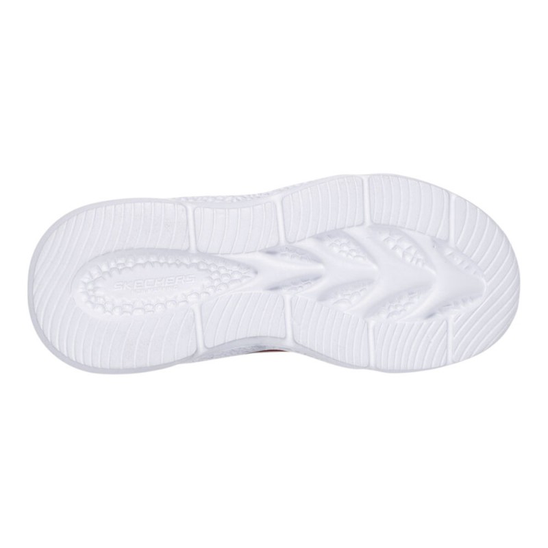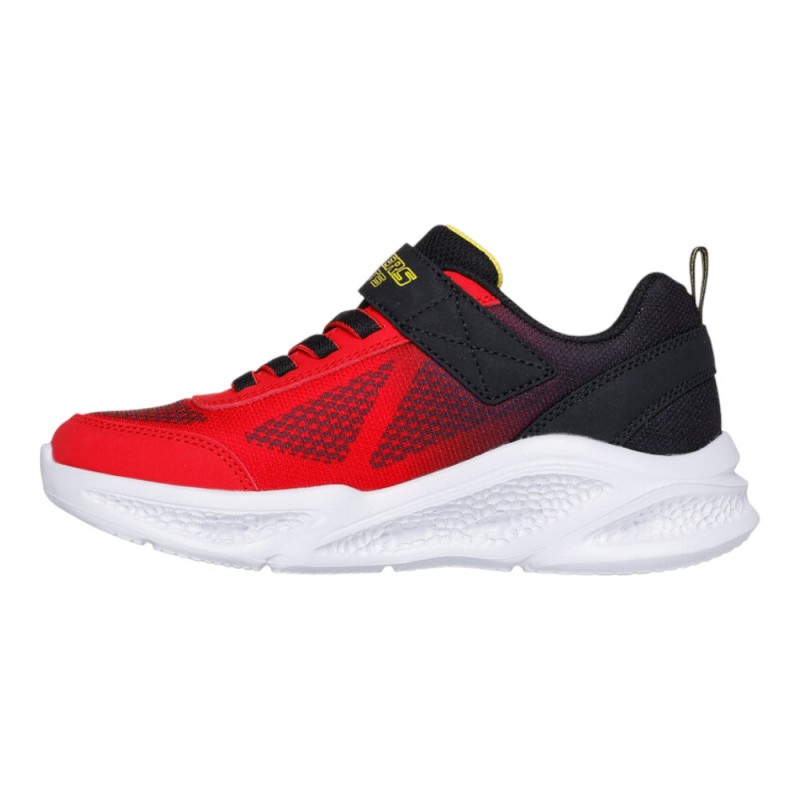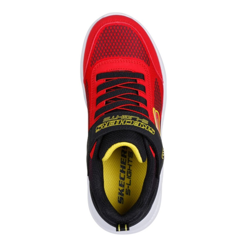 Fantásticas zapatillas niño de luces Skechers diseñadas en color rojo con detalles en amarillo y negro, súper llamativas y con luces intermitentes en la suela, con las que llamarán la atención de todo el mundo a cada paso.